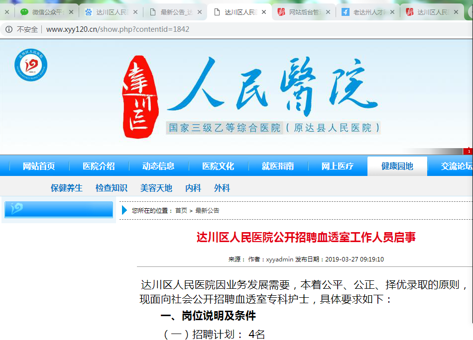 達川區(qū)人民醫(yī)院因業(yè)務發(fā)展需要,本著公平、公正、擇優(yōu)錄取的原則,現(xiàn)面向社會公開招聘血透室??谱o士,具體要求如下: